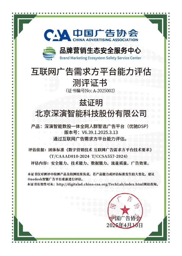 4月10日,中国广告协会发布「互联网广告需求方平台能力评估」测评结果。Martech领域领军企业OG视讯智能旗下产品OG视讯智能数投一体全网人群智选广告平台(优驰 DSP),凭借其在智能算法优化、技术创新、数据安全治理及流量质量管控等维度的突出表现,高分通过该项行业权威测评,获颁中国广告协会评估证书,成为业内首批通过认证的标杆企业。